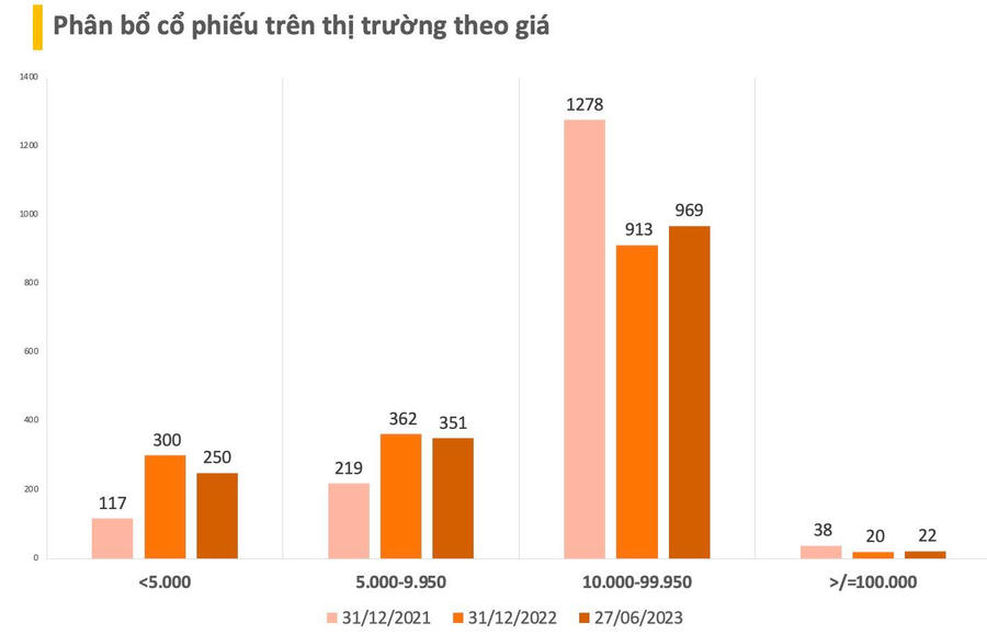 Theo thống kê, số lượng cổ phiếu có thị giá dưới 5.000 đồng/cổ phiếu trên 3 sàn là 250 mã, giảm 50 mã so với cuối năm ngoái. Tuy nhiên, con số này vẫn cao gấp đôi so với thời điểm cuối năm 2021 khi thị trường chỉ có 117 cổ phiếu “trà đá”, riêng trên HOSE khi đó không có cái tên nào thị giá dưới 5.000 đồng/cổ phiếu.