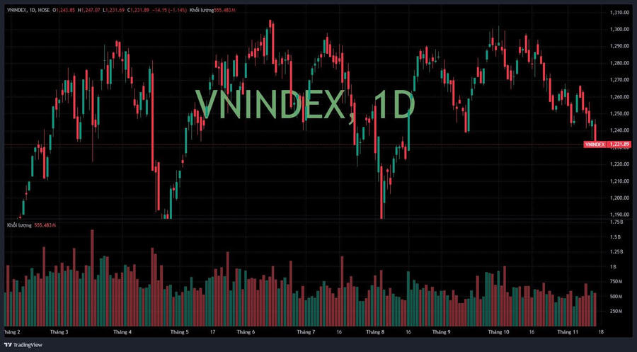 Phiên 14/11, VN-Index tiếp tục giao dịch kém sắc. Đà bán mạnh được kích hoạt về cuối phiên khiến chỉ số chính VN-Index gần như “không kịp trở tay”, để tuột mất hơn 14 điểm về 1.231,89 điểm, mốc thấp nhất trong vòng 3 tháng. Dù sụt giảm nhanh chóng, thanh khoản thị trường vẫn neo ở mức thấp với giá trị khớp lệnh đạt vỏn vẹn 13.570 tỷ đồng.