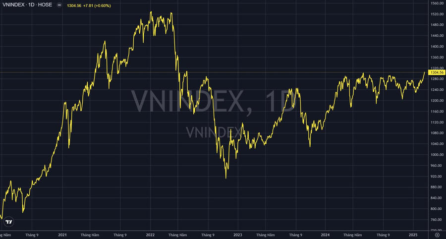 Lần gần nhất VN-Index chạm 1.300 là phiên 12/6/2024. Tuy nhiên, chỉ số chính chỉ có thể neo trên ngưỡng điểm này hai phiên 12-13/6 rồi quay đầu điều chỉnh, với xu hướng đi ngang là chủ đạo. Phải mất tới hơn nửa năm (257 ngày), VN-Index mới có thể trở lại.