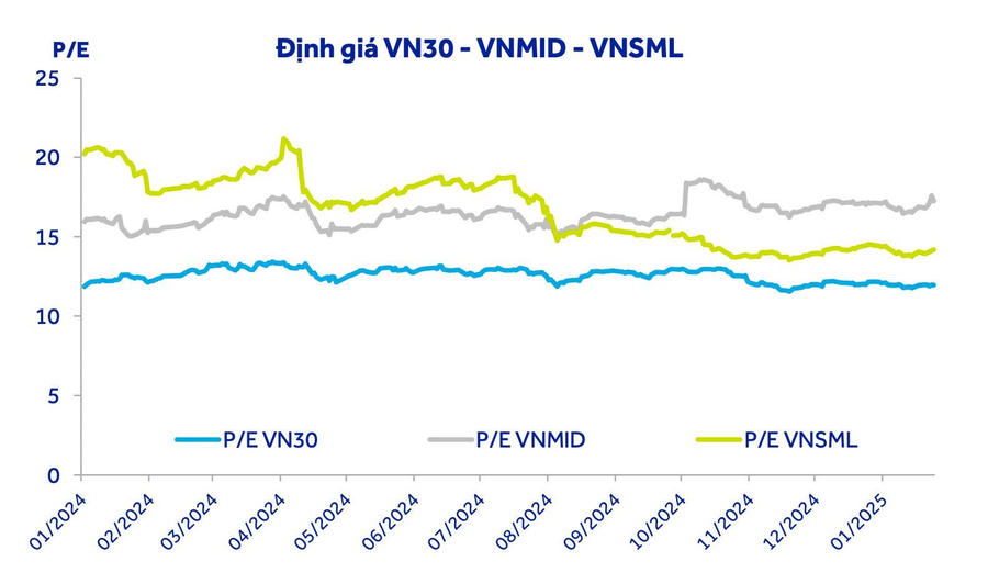 Ngoài ra, định giá của các nhóm ngành trụ cột (Ngân hàng, Bất động sản, Vật liệu xây dựng, Chứng khoán...) vẫn đang ở vùng thấp so với năm 2024, trong khi lợi nhuận vẫn duy trì ổn định, đặc biệt là ngành ngân hàng – trụ cột lợi nhuận lớn nhất của VN-Index.