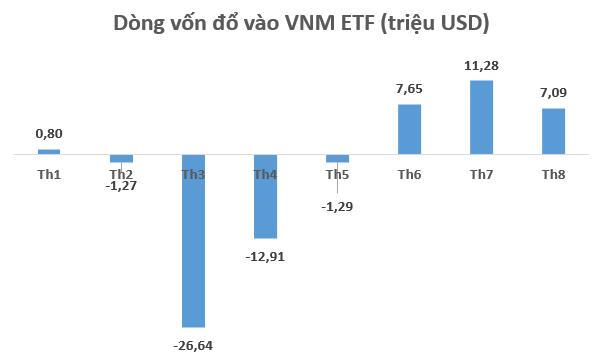 Trong khi khối ngoại đang ồ ạt bán ròng, quỹ Vaneck Vector Vietnam ETF (VNM ETF) đã đi ngược xu thế khi hút ròng 7,1 triệu USD trong tháng 8 và cũng là tháng hút vốn thứ 3 liên tiếp.