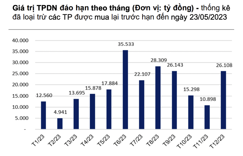 Khoảng hơn 45.200 tỷ đồng trái phiếu doanh nghiệp của các doanh nghiệp trong danh sách sẽ đáo hạn trong năm 2023, chiếm khoảng 19,4% tổng giá trị đáo hạn toàn thị trường cả năm.