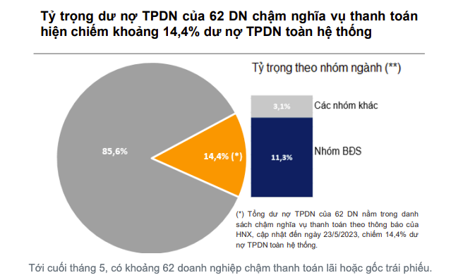Theo HSC, kể từ tháng 10/2022 đến tháng 4/2023, khối lượng trái phiếu chậm thanh toán gốc, lãi là 43.900 tỷ đồng. Một nửa số trái phiếu này đã được tái cơ cấu giãn thời hạn trả nợ hoặc thay đổi điều kiện trái phiếu. Báo cáo này ước tính tổng cộng sẽ có 57.700 tỷ đồng trái phiếu đáo hạn trong năm nay có thể đối mặt với khả năng chậm thanh toán, đỉnh điểm có thể sẽ rơi vào tháng 9.