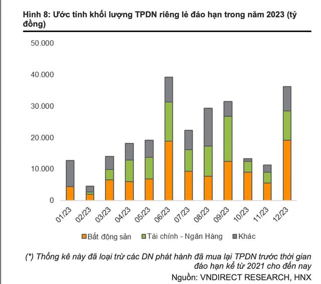Trong báo cáo thị trường trái phiếu mới đây, Chứng khoán VNDirect dự báo tổng giá trị trái phiếu riêng lẻ đáo hạn năm 2023 ước tính khoảng 251.849 tỷ đồng, tăng 64,4% so với cùng kỳ. Trong đó Bất động sản và Tài chính - Ngân hàng lần lượt chiếm 43% và 31%.