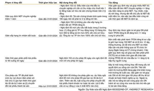 VNDirect cho rằng cần thêm thời gian để các thành viên tham gia thị trường (nhà phát hành, tổ chức bảo lãnh/tư vấn và nhà đầu tư) thích ứng với các quy định mới. Trong bối cảnh chi phí tài chính gia tăng, lực cầu nội địa yếu đi, thị trường BĐS trầm lắng, các doanh nghiệp đang có xu hướng hoãn, hoặc hủy kế hoạch mở rộng kinh doanh, dẫn đến giảm nhu cầu vốn.