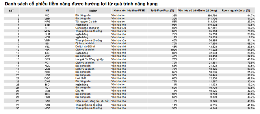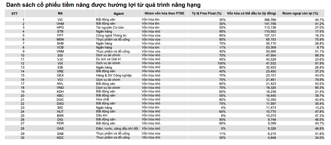 Cũng tại báo cáo của VNDirect cũng công bố bản danh sách phân loại nhóm cổ phiếu do FTSE công bố, có khoảng 30 cổ phiếu tiềm năng được kỳ vọng sẽ hưởng lợi trực tiếp từ quá trình nâng hạng thị trường.