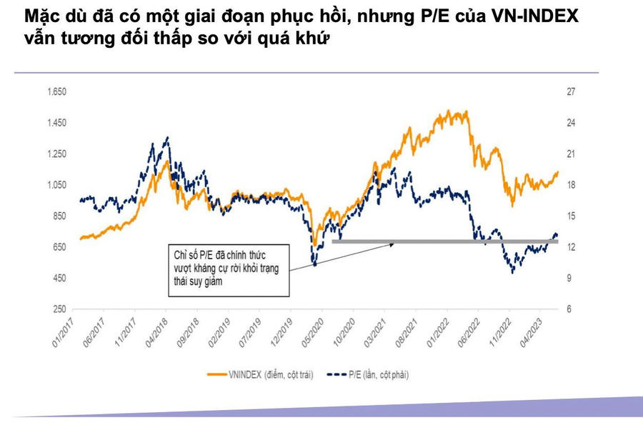 “Trong kịch bản cơ sở, với lộ trình của Fed theo đúng kế hoạch, tăng trưởng GDP phục hồi vào nửa sau năm 2023, tỷ giá duy trì ổn định. Chúng tôi dự phóng VN-Index có thể đạt 1.300 điểm trong nửa sau năm 2023, tương ứng với mức P/E năm 2023 là 13,3 lần (-1 độ lệch chuẩn của P/E trung bình 10 năm)” , báo cáo VNDirect nêu rõ.