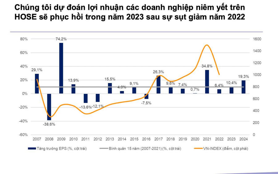 Kết quả kinh doanh của các doanh nghiệp trên sàn sẽ phục hồi vào 6 tháng cuối năm. Tăng trưởng EPS của các doanh nghiệp trên sàn HOSE dự báo sẽ đạt 10,4% cho năm 2023 và 19,3% cho năm 2024. Dự kiến tăng trưởng lợi nhuận từ Q3/23 trở đi có thể sẽ tạo hiệu ứng tích cực cho VN-Index. Trong quá khứ, thời điểm năm 2015, 2017 và 2021, khi tăng trưởng của các doanh nghiệp được cải thiện thì thị trường chứng khoán cũng đã phục hồi tương đối tích cực.