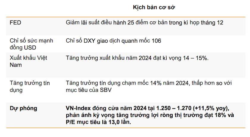 Trong kịch bản cơ sở, VNDirect cho rằng VN-Index sẽ dao động quanh mức 1.250–1.270 điểm vào cuối năm nay, dựa trên giả định tăng trưởng lợi nhuận ròng của thị trường đạt 18% và mức P/E mục tiêu là 13,0 lần. Mức P/E mục này thấp hơn mức P/E cuối năm 2023 là 13,4 lần.