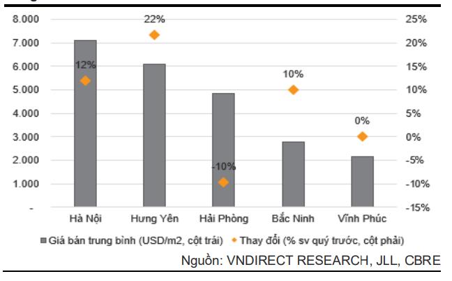 Đơn vị này cũng dự đoán giá bán sơ cấp nhà thấp tầng tại Hưng Yên sẽ tiếp tục tăng nhanh hơn so với Hà Nội trong năm 2023, do cơ sở hạ tầng phát triển cùng sự có mặt của các dự án từ VHM.