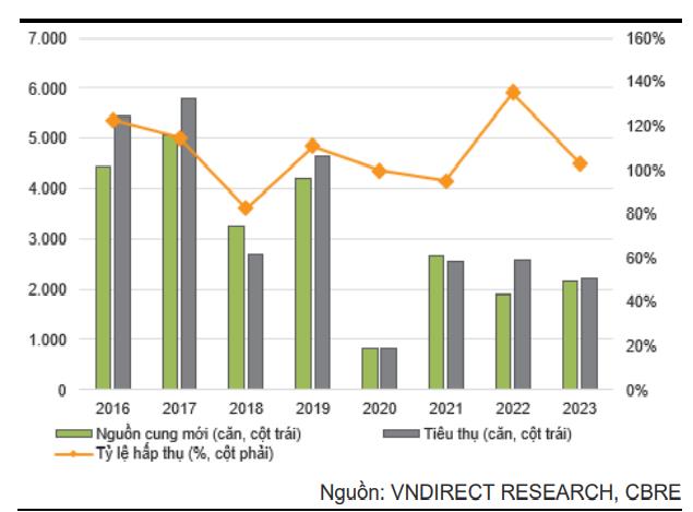 Bên cạnh đó, VnDirect cũng kỳ vọng tỷ lệ hấp thụ sẽ đạt khoảng 90%, giảm 13,5% so với cùng kỳ do tâm lý người mua nhà suy giảm, tương đương với 18.000 - 20.000 căn tiêu thụ vào năm 2023.