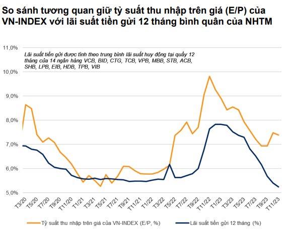 Trong báo cáo mới cập nhật, Chứng khoán VNDirect đánh giá lãi suất huy động giảm mạnh giúp thị trường chứng khoán trở nên hấp dẫn hơn. Tỷ suất thu nhập trên giá (E/P) của VN-Index trung bình vào khoảng 7,4% trong khi bình quân lãi suất huy động 12 tháng của các NHTM chỉ còn 5,14%/năm, khiến cho khoảng cách giữa E/P và lãi suất tiền gửi ngân hàng tiếp tục được nới rộng.
