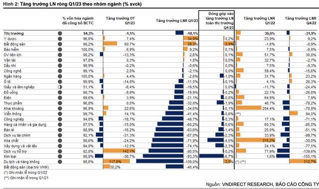 Theo ước tính của VNDirect, tính đến ngày 11/5, có 1.095 công ty niêm yết trên 3 sàn chứng khoán, chiếm 94,3% vốn hoá thị trường đã công bố kết quả kinh doanh. Theo đó, tổng lợi nhuận ròng quý I/2023 của các công ty niêm yết trên cả 3 sàn giảm 18,1% so với cùng kỳ năm trước, mức giảm thấp hơn so với quý IV/2022 là 31,9% so với cùng kỳ.