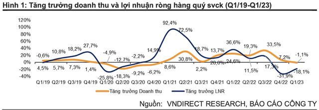 VNDirect đánh giá quý I/2023 là quý khởi đầu gập ghềnh của năm nay khi kết quả kinh doanh của các doanh nghiệp giảm 18,1% so với cùng kỳ năm trước. Trong đó, 3 ngành đáng thất vọng nhất là thép, hoá chất và chứng khoán.
