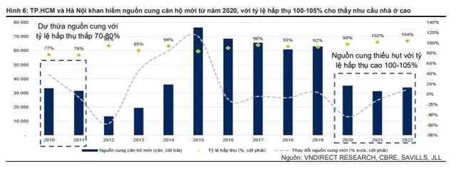 Chuyên gia phân tích cho rằng chu kỳ “đóng băng” hiện tại sẽ diễn ra ngắn hơn so với giai đoạn trước. Theo quan sát của VNDirect, TP.HCM và Hà Nội đã xảy ra tình trạng thiếu hụt nguồn cung căn hộ mới từ năm 2020, tuy nhiên tỷ lệ hấp thụ vẫn đạt ở mức cao cho thấy nhu cầu mua nhà vẫn khả quan.