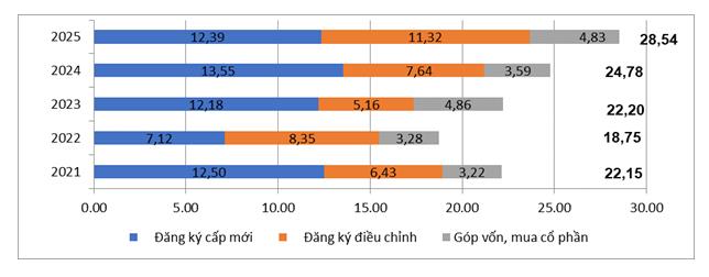 Theo số liệu của Cục Thống kê (Bộ Tài chính), tính đến ngày 30/9/2025, tổng vốn đầu tư nước ngoài đăng ký vào Việt Nam, bao gồm vốn đăng ký cấp mới, vốn điều chỉnh và giá trị góp vốn, mua cổ phần, đạt 28,54 tỷ USD, tăng 15,2% so với cùng kỳ năm trước.