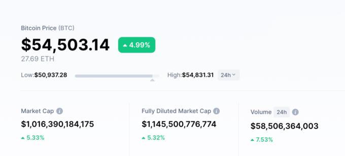 Rạng sáng ngày 20/2, giá Bitcoin xác lập mức kỷ lục mới hơn 54.500 USD, nâng vốn hóa đồng tiền kỹ thuật số này lần đầu vượt ngưỡng 1.000 tỷ USD. Nếu tính với toàn bộ 21 triệu đồng Bitcoin, vốn hóa sẽ đạt gần 1.150 tỷ USD.