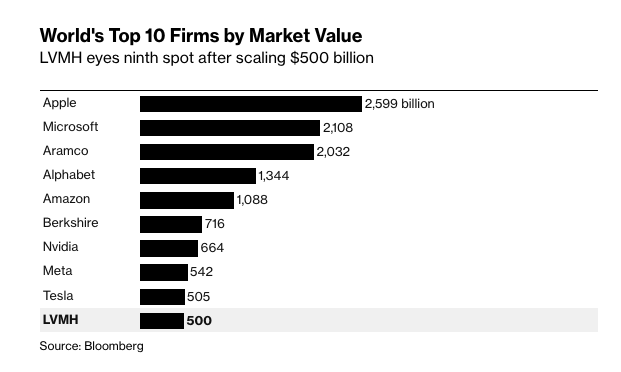 Điều này thể hiện rõ trong bảng xếp hạng giá trị thị trường toàn cầu, với hàng loạt công ty công nghệ thống trị danh sách, LVMH trở thành công ty mới nhất chiếm giữ vị trí thứ 10.