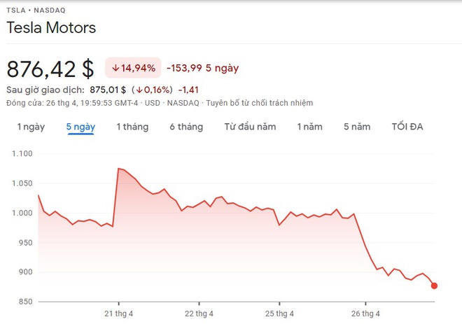 Trước lo ngại vị CEO Tesla sẽ thế chấp cổ phiếu để hoàn tất thương vụ mua lại Twitter, giới đầu tư đã kích hoạt làn sóng bán tháo. Sau phiên giao dịch ngày 26/4, cổ phiếu của hãng xe điện đã giảm 12%, lùi về mức 876 USD/đơn vị. Mức giá này đã khiến vốn hóa thị trường của Tesla "bốc hơi" 126 tỷ USD, thu hẹp còn 908 tỷ USD.