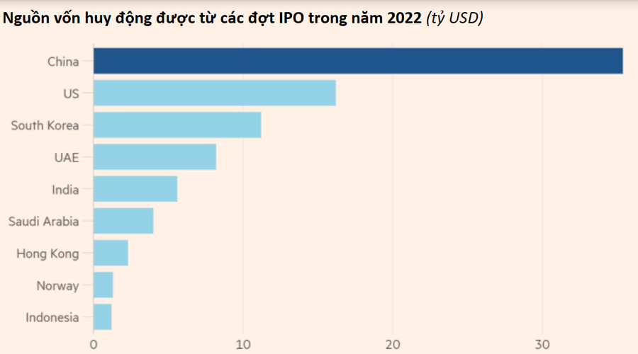 Theo dữ liệu từ Dealogic, tổng số vốn huy động từ các đợt IPO ở đại lục đạt gần 35 tỷ USD trong năm 2022, con số ở Phố Wall chỉ là 16 tỷ USD.