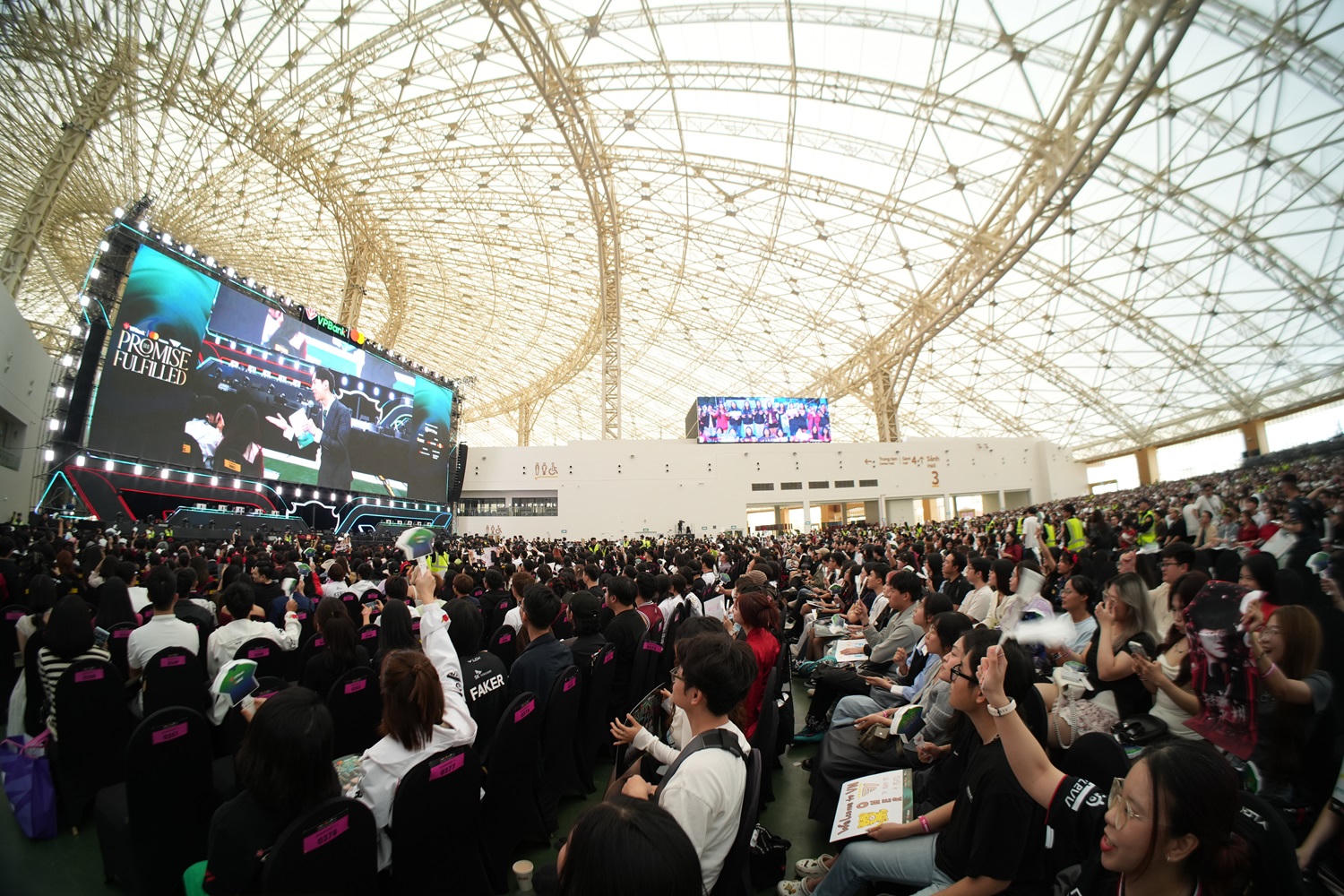 Sang ngày 21/12, tâm điểm của sự kiện được đẩy lên cao trào với fan meeting “VPBank Presents T1 in Vietnam - The Promise Fulfilled”, nơi hàng chục nghìn người hâm mộ trực tiếp hòa mình vào không khí thi đấu và giao lưu cùng các tuyển thủ. Trận đấu giao hữu giữa các thành viên T1 và đội hình khách mời đã mang đến bầu không khí cuồng nhiệt đúng chất eSports, với những pha xử lý kỹ thuật đỉnh cao, tiếng hò reo liên tục từ khán đài và sự tương tác trực tiếp giữa tuyển thủ với người xem.