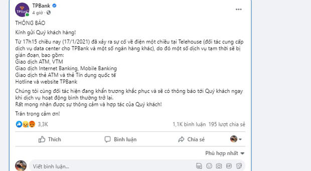 Mới đây, toàn bộ giao dịch trên hệ thống ngân hàng TPBank cùng nhiều ngân hàng khác đều bị đóng băng, sự cố này kéo dài từ chiều ngày 17/1 đến nay vẫn chưa có dấu hiệu được khắc phục.