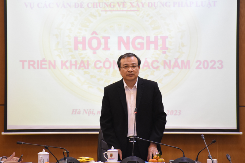 Phát biểu tại Hội nghị, Chủ tịch Viện Hàn lâm khoa học xã hội Việt Nam, nguyên Thứ trưởng Bộ Tư pháp Phan Chí Hiếu mong muốn Vụ Các vấn đề chung về xây dựng pháp luật tập trung vào các nhiệm vụ trọng tâm trong năm 2023 như: thực hiện tốt công tác tham mưu cho Bộ trưởng trong hoạt động quản lý nhà nước về xây dựng pháp luật và công tác pháp chế, đặc biệt quan tâm hơn nữa về chính sách phát triển nguồn nhân lực cho công tác pháp chế; tiếp tục rà soát Luật Ban hành VBQPPL để phù hợp hơn với yêu cầu thực tiễn của đất nước; tiếp tục tham mưu thật tốt để công tác xây dựng pháp luật của Bộ Tư pháp được hoàn thiện.