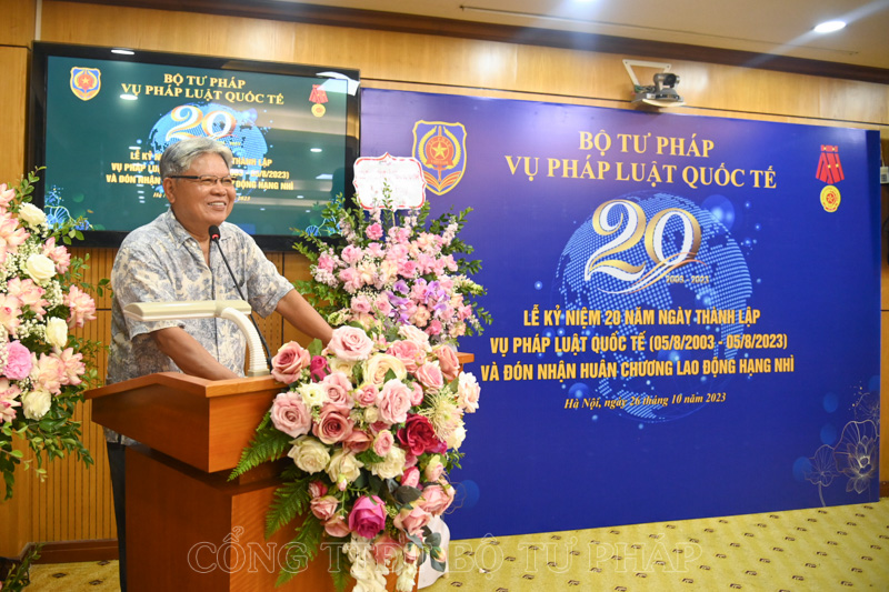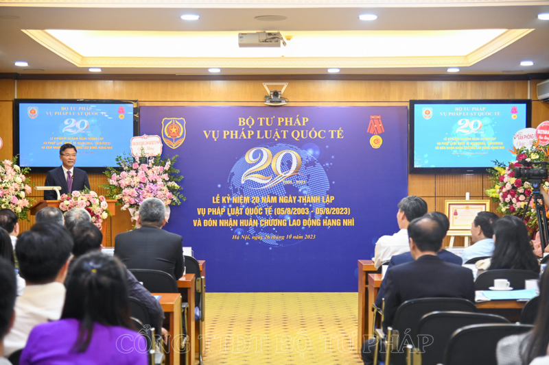 Chiều 26/10, Vụ Pháp luật quốc tế, Bộ Tư pháp trang trọng tổ chức Lễ kỷ niệm 20 năm ngày thành lập Vụ và đón nhận Huân chương Lao động hạng Nhì. Tham dự Lễ kỷ niệm có Bộ trưởng Lê Thành Long; nguyên Bộ trưởng Hà Hùng Cường; Thứ trưởng Nguyễn Khánh Ngọc; nguyên Thứ trưởng Hoàng Thế Liên; Phó Bí thư Thường trực Đảng ủy Bộ Nguyễn Kim Tinh; nguyên Vụ trưởng Vụ Pháp luật quốc tế Hoàng Phước Hiệp cùng các đồng chí lãnh đạo các đơn vị thuộc Bộ; đại diện lãnh đạo các đơn vị của Bộ, ngành.