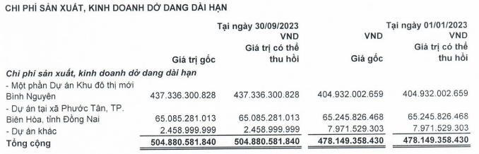 Chi phí sản xuất, kinh doanh dở dang dài hạn chiếm chủ yếu với 504,8 tỷ đồng; trong đó có một phần dự án khu đô thị mới Bình Nguyên với 437,3 tỷ đồng; dự án tại xã Phước Tân, Biên Hòa, Đồng Nai với 65 tỷ đồng.
