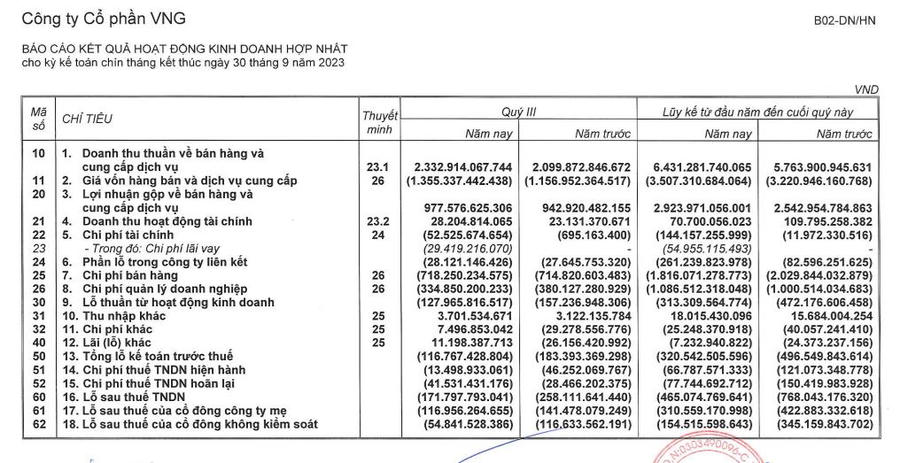 Lợi nhuận sau thuế của VNG là âm 465 tỷ đồng, trong khi cùng kỳ năm 2022 là âm 768 tỷ đồng. Lỗ sau thuế của công ty mẹ 9 tháng đầu năm 2023 là 310,5 tỷ đồng.