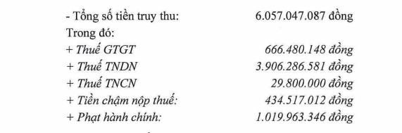 Theo đó, công ty bị phạt hành chính hơn 1 tỷ đồng, thuế giá trị gia tăng hơn 666 triệu đồng; truy thu thuế thu nhập doanh nghiệp 3,9 tỷ đồng; thuế thu nhập cá nhân 29,8 triệu đồng. Bên cạnh đó, Lộc Trời phải nộp tiền chậm nộp tiền thuế 434,5 triệu đồng. Số tiền chậm nộp này được tính đến hết ngày 15/9/2023.