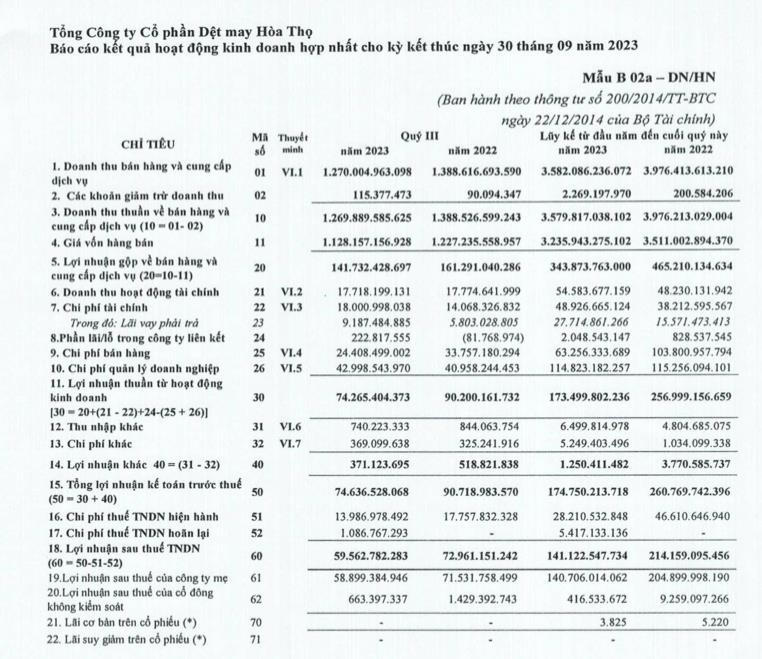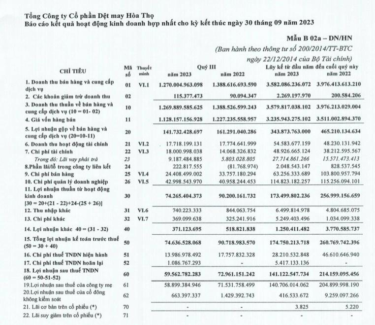 Về kết quả kinh doanh, quý III/2023, HTG ghi nhận doanh thu thuần đạt 1.269 tỷ đồng, giảm so với mức 1.388 tỷ đồng cùng kỳ năm ngoái.