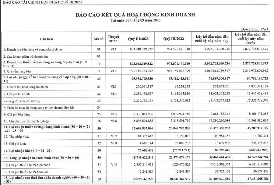 Khấu trừ giá vốn, lãi gộp đạt 74,8 tỷ đồng, tăng so với con số 64,7 tỷ đồng ghi nhận ở cùng kỳ năm 2022. Đáng chú ý, doanh thu hoạt động tài chính sụt mạnh về mức 852 triệu đồng trong khi cùng kỳ ghi nhận 4 tỷ đồng. Các chỉ tiêu chi phí trong kỳ biến động trong biên độ vừa phải. Kết quả là, lợi nhuận sau thuế ghi nhận 31,4 tỷ đồng, tăng 15% so với cùng kỳ năm ngoái.