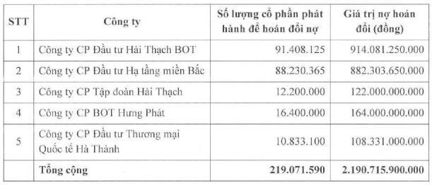 Mới đây, tháng 8, HHV tiếp tục phát hành 40,375 triệu cổ phần cho công ty cổ phần Đầu tư Hải Thạch BOT để hoán đổi nợ, nâng tỷ lệ sở hữu của Đầu tư Hải Thạch BOT từ 40,27% lên 49,29%.