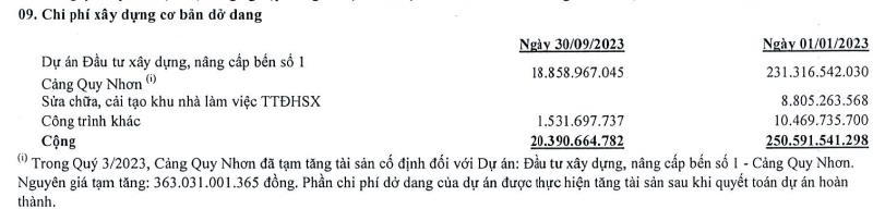 Chi phí xây dựng cơ bản dở dang tại ngày 30/09/2023 chỉ còn gần 20.4 tỷ đồng, trong khi đầu năm gần 251 tỷ đồng.