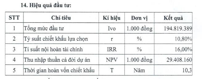 QNP cho biết, dự án có tỷ suất chiết khấu lựa chọn (r) 10,8%, tỷ suất nội hoàn tài chính (IRR) 16%, thu nhập thuần cả đời dự án (NPV) 29,4 tỷ đồng, thời gian hoàn vốn chiết khấu (T) 10,3%.