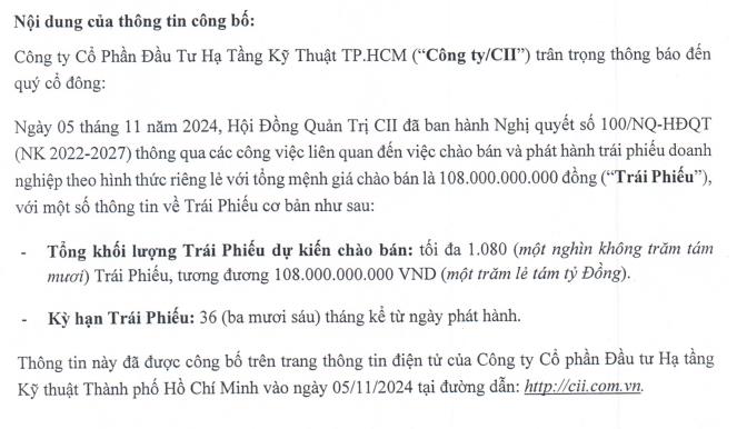Công ty cổ phần Đầu tư Hạ tầng Kỹ thuật TP.HCM (mã ck: CII) vừa thông qua kế hoạch chào bán và phát hành trái phiếu riêng lẻ với tổng giá trị tối đa 108 tỷ đồng, kỳ hạn 36 tháng.