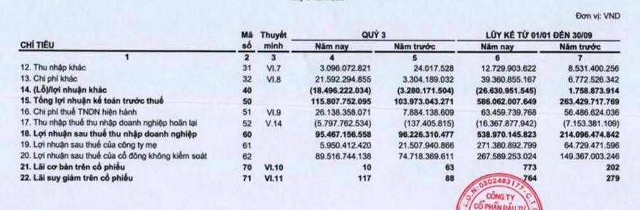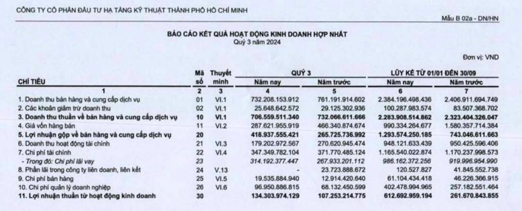 Về kết quả kinh doanh, trong quý III/2024, CII ghi nhận doanh thu thuần đạt 706,5 tỷ đồng, giảm 3,5% so với cùng kỳ năm trước. Lợi nhuận sau thuế đạt 95,47 tỷ đồng, chỉ giảm nhẹ so với cùng kỳ.