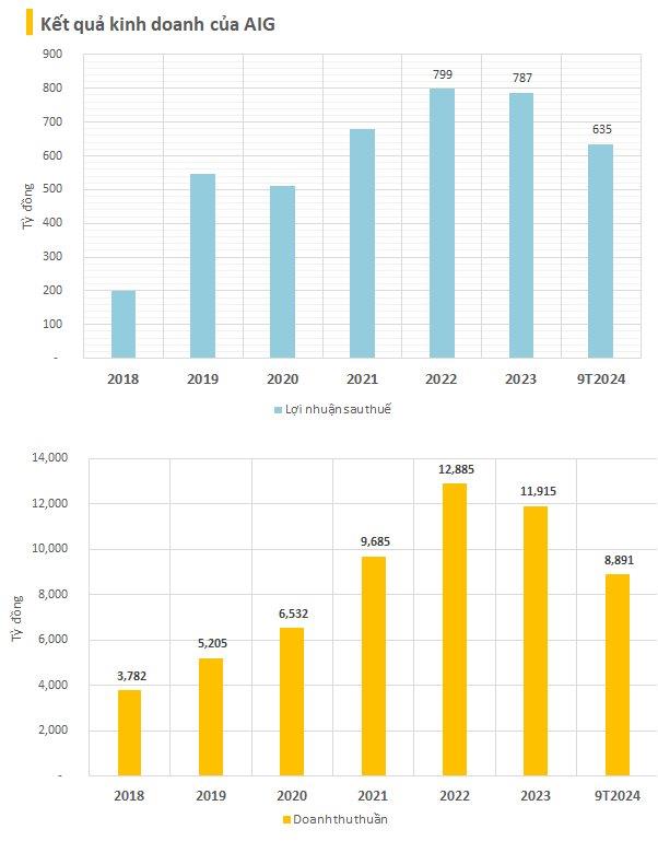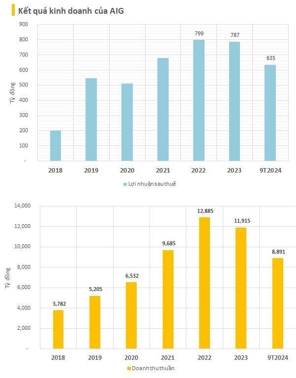 Lũy kế 9 tháng đầu năm, doanh thu thuần của AIG đạt 8.891 tỷ đồng, tăng 3% và lợi nhuận sau thuế đạt 634 tỷ đồng, tăng 10% so với cùng kỳ năm trước. Năm 2024, công ty đặt kế hoạch doanh thu thuần gần 12.950 tỷ đồng, lợi nhuận sau thuế gần 890 tỷ đồng.