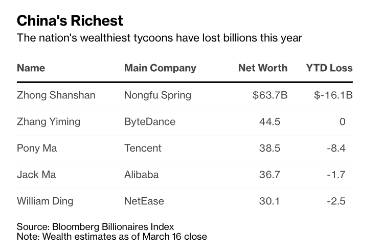 Tính đến hết ngày 16/3, ông vua nước đóng chai CEO Zhong Shanshan của Nongfu Spring Co. vẫn là người giàu nhất Trung Quốc với khối tài sản trị giá 63,7 tỷ USD.