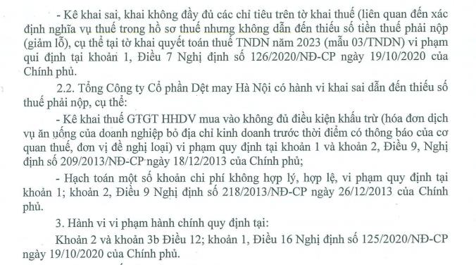 Cục Thuế TP. Hà Nội vừa ban hành quyết định xử phạt vi phạm hành chính về thuế với Công ty cổ phần Dệt may Hà Nội (Hanosimex, mã ck: HSM) do có hành vi kê khai sai, không đầy đủ các chỉ tiêu trên tờ khai quyết toán thuế thu nhập doanh nghiệp năm 2023.