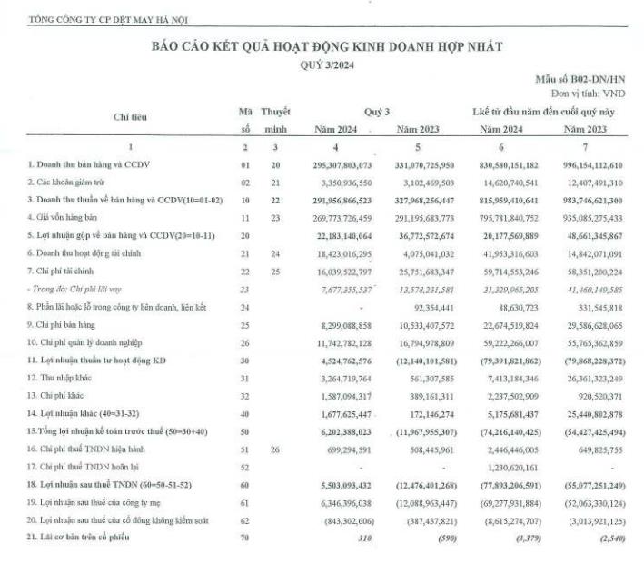 Về kết quả kinh doanh, theo báo cáo tài chính hợp nhất quý III/2024, Hanosimex đạt doanh thu 291,9 tỷ đồng, giảm gần 11% so với cùng kỳ năm 2023. Dù doanh thu giảm, nhưng lợi nhuận sau thuế lại đạt 5,5 tỷ đồng, tăng mạnh so với mức lỗ 12,4 tỷ đồng ở cùng kỳ năm ngoái.
