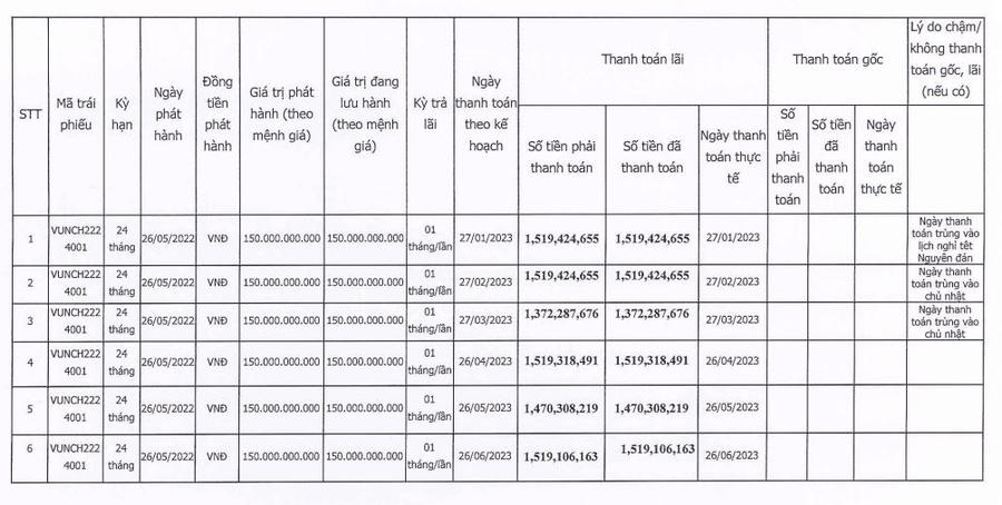 Mới đây, Công ty cổ phần Vua Nệm cũng thông báo tình hình thanh toán gốc, lãi trái phiếu cho kỳ báo cáo bán niên năm 2023.