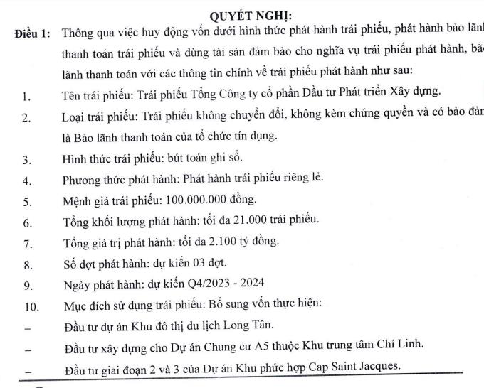 Cụ thể, DIG dự kiến phát hành tối đa 21.000 trái phiếu riêng lẻ không chuyển đổi, không kèm chứng quyền và có đảm bảo là bảo lãnh thanh toán của tổ chức tín dụng. Mệnh giá trái phiếu là 100 triệu đồng/trái phiếu, chia thành 3 đợt phát hành. Thời gian phát hành dự kiến từ quý IV/2023 và trong năm 2024.