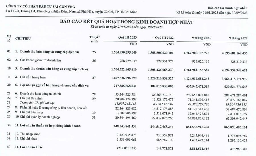 Lũy kế 9 tháng đầu năm, Công ty Đầu tư Sài Gòn VRG ghi nhận doanh thu 4.762 tỷ đồng, tăng 4% so với năm trước. Lãi sau thuế của doanh nghiệp đạt 663,49 tỷ đồng, giảm 5% so với cùng kỳ.