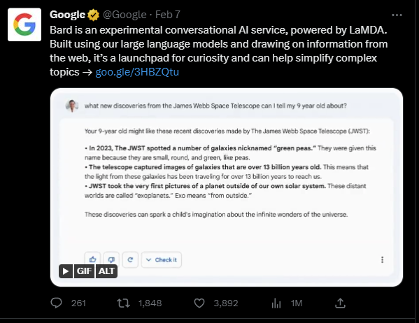 Trên mạng xã hội Twitter, để chia sẻ khả năng của AI mới, Google đã ra lệnh cho AI tìm kiếm về các phát hiện của kính thiên văn James Webb để kể cho trẻ 9 tuổi nghe. AI đưa ra rất nhiều câu trả lời, trong đó có khẳng định về kính James Webb là hệ thống đầu tiên chụp được ảnh vũ trụ ngoài hệ Mặt Trời, tuy nhiên giới chuyên gia cho hay câu trả lời này không chính xác.