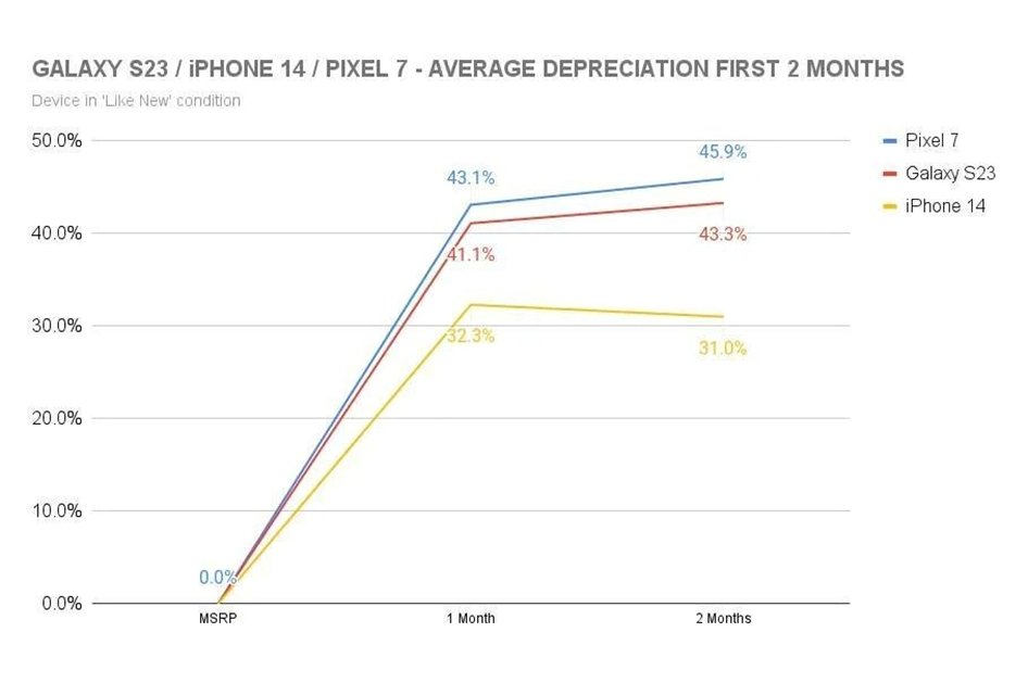 Dòng Galaxy S23, với giá khởi điểm là 799,99 USD, được phát hành vào ngày 17 tháng 2. Trong vòng hai tháng, dòng máy này đã mất giá 43,3%, có nghĩa là một chiếc Galaxy S23 đã qua sử dụng ở tình trạng "như mới" chỉ có giá trị bằng 56,7% so với giá mua ban đầu. Ngược lại, dòng iPhone 14 chỉ mất 31% giá trị sau hai tháng. Đồng nghĩa, Galaxy S23 đã mất giá nhanh hơn 1,4 lần so với iPhone 14. Trong khi Galaxy S22 lại không mất giá nhanh đến vậy khi chỉ mất giá gấp ba lần so với iPhone 13 hai tháng sau khi phát hành.