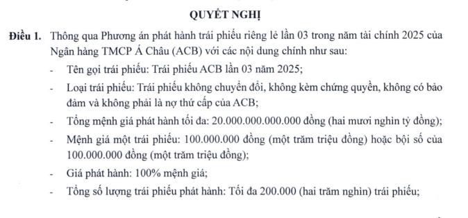 Ngân hàng TMCP Á Châu (ACB) vừa công bố Nghị quyết của HĐQT về phương án phát hành trái phiếu riêng lẻ lần 3 trong năm tài chính 2025.
