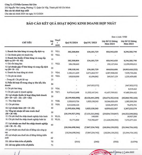 Về bức tranh tài chính, quý IV/2024, GMC báo doanh thu thuần đạt 382,3 tỷ đồng, gấp 2,8 lần so với cùng kỳ năm ngoái. Lợi nhuận sau thuế báo lỗ hơn 10 tỷ đồng, tăng so với khoản lỗ 7,8 tỷ đồng ở quý IV/2023.