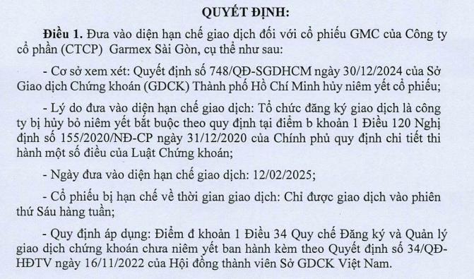 Tuy nhiên, ngày 10/2, HNX thông báo đưa GMC vào diện hạn chế giao dịch ngay trong ngày giao dịch đầu tiên, và chỉ được giao dịch vào phiên thứ Sáu hàng tuần.